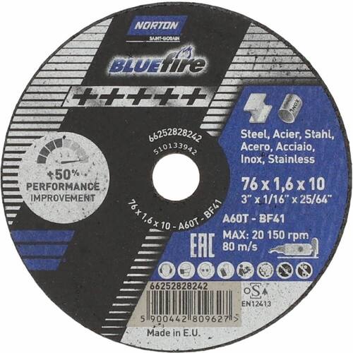 Disco de Corte Blue Fire 76x1,6x10mm - 66252828242 - NORTON Descrição: Sua formulação com grãos abrasivos de alto desempenho permite maior conforto durante a operação. Características: Possui alto rendimento durante as operações - Diâmetro do disco: 76mm - Espessura: 1.0mm ou 1.6mm - Diâmetro do furo: 10.00mm - Diâmetro do disco: 3 - Espessura: 3/64 ou 1/16 - Diâmetro do furo: 25/64 - Máquina para utilização: Retífica - Superfície para aplicação: Ligas de aço inoxidável e aços em geral - RPM: 20150 - Operação: Corte * Imagens meramente ilustrativas