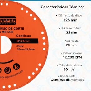 Características Técnicas Diâmetro do disco: 125 mm Diâmetro do furo: 22 mm Anel redutor: 20 mm Tipo de corte: Contínuo diamantado Rotação máxima: 12.200 RPM Velocidade máxima: 80 m/s Equipamento compatível: Esmerilhadeira angular (125 mm) Código Interno: 8271224 Marca: Starfer