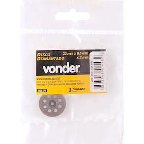 Disco de Corte Diamantado 22Mm Para Micro Retífica Vonder O Disco de Corte Diamantado 22mm para Micro Retífica Vonder é a ferramenta perfeita para realizar cortes precisos em diversos materiais. Com sua tecnologia diamantada, ele proporciona maior durabilidade e pouco desgaste, garantindo cortes retos precisos e com pouca poeira. Com um diâmetro de 22mm, espessura do corpo do disco de 0,5mm e diâmetro do furo de 2mm, esse disco de corte é compatível com todas as marcas vendidas no mercado nacional, como 300, 395, 3000, 400, 4000, 8220. Além disso, ele foi desenvolvido para durar e não perder seu formato ao longo do tempo. Com o Disco de Corte Diamantado Vonder, você pode trabalhar com uma ampla variedade de materiais, como vidro, cerâmica, porcelana, pisos, azulejo, coral marinho, quartzo, cristais, pedras, mármore e granito. Ele oferece cortes finos e bem acabados, permitindo que você realize seus projetos com precisão e qualidade. Adquira agora mesmo o Disco de Corte Diamantado 22mm para Micro Retífica Vonder e tenha em suas mãos uma ferramenta de alta qualidade e desempenho. Aproveite a de 90 dias contra defeitos de fabricação e tenha a certeza de estar adquirindo um produto confiável e durável. *Imagem meramente ilustrativa.