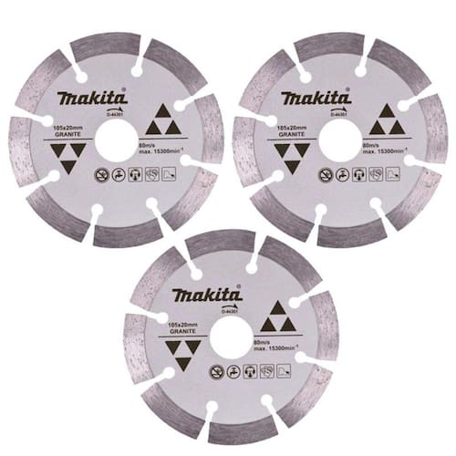 Disco de Corte Diamantado 4.1/8 POL 105 MM para Granito D-44351 com 3 Unidades MAKITA Disco de Corte Diamantado; Maior camada Diamantada Aumentando a produtividade, corte mais rápido e fácil; Corte seco ou àgua, trazendo maior versatilidade; Utilizando em granitos, mármores, produtos cerâmicos, tijolos de construção, pedras em geral CARACTERÍSTICAS: Furo: 20mm (3/4") Diâmetro: 105 mm (4") Volocidade: 15300 RPM Marca: Makita Referência: D-44351 Garantia contra defeitos de fabricação.