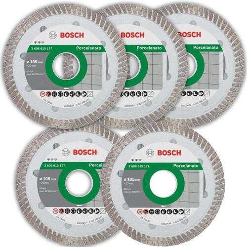 Combo com 5 Discos de Corte Diamantados 4.3/8 POL Fino para Porcelanato 105 MM Turbo BOSCH Acabamento fino e preciso com boa velocidade de corte, com efeito de resfriamento que evita aquecimento e danos no disco. Adequada para os principais revestimentos duro do mercado, como porcelanatos, placas de mármore e granito, com excelente vida útil também em aplicações secas. Com menos vibração e mais estabilidade do que a concorrência devido à espessura do corpo do disco 1,2 mm que garante menores deformações ao esquentar. Apropriado para os instaladores de piso, pedreiros, instaladores de mármore e granito e construção civil em geral. VANTAGENS: Design turbo fino Corte fino (1,2mm) Performance DADOS TÉCNICOS: Diâmetro do disco: 105mm Diâmetro do furo: 20mm Espessura mm: 1,2mm Código: 2608615177000 Marca: Bosch Quantidade na embalagem: 5 unidades