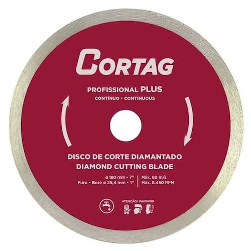 Disco De Corte Diamantado Profissional Plus 180mm Cortag O Disco de Corte Diamantado Profissional Plus 180mm Cortag é ideal para cortes em Cerâmica, Azulejo, Telha, Tijolo e Porcelanatos. Características Marca: Cortag; Indicado para uso no Cortador Elétrico ZAPP 180; Perfil: Contínuo; Diâmetro do Disco: 180 mm; Diâmetro do furo: 22,2 mm; Tipo de corte: refrigerado; Bucha de redução: N; Rotação: 8.450 RPM. Componentes: 1 Disco De Corte Diamantado Profissional Plus 180mm Cortag. Dimensão Aprox. Diâmetro: 180mm; Peso aproximado: 340gr. : 6 Meses Marca: Não Informado