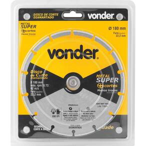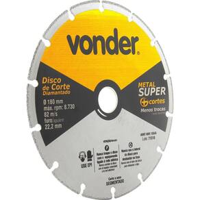 Conteúdo Embalagem:1 Disco de corte diamantadoDestaques e diferenciais:Produto de altíssima qualidade com alta performance. Comparado a um disco abrasivo convencional, pode obter um rendimento de até 10 vezes superior, considerando as mesmas condições e aplicações espessura e dureza do material, temperatura ambiente, potência do equipamento, etc . Reduz o risco de acidentes por ser um disco de metalAplicações e dicas de uso:Indicado para cortar metais, utilizado em esmerilhadeiras Características Técnicas: Diâmetro externo do disco de corte diamantado: 180 mmDiâmetro do furo do disco de corte diamantado: 22,2 mm Perfil do corte: SegmentadoRotação máxima rpm : 8730 /minSegue norma: ABNT NBR 15545 : legal: 90 dias Ean: 7893946554811