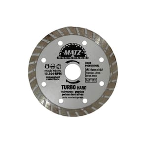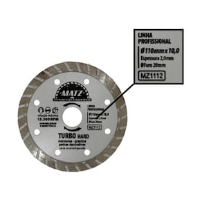 Informações técnicas: Perfil do corte: Turbo Diamantado Tipo de corte: A seco e refrigerado Dimensões: - Diâmetro externo: 110mm 4.3/8'' - Diâmetro do furo: 20mm - Perfil de corte: 10mm - Espessura: 2mm Rotação máxima por minuto RPM : 13.300 - 80m/s Para corte de: Mármore, granito e pedra decorativa Proporciona qualidade e produtividade na operação Produto de altíssima qualidade com alta performance