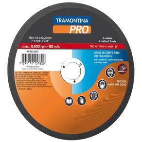 Utilizado no corte de aço inox, a linha de discos de corte fino da Tramontina PRO é produzida e testada para garantir segurança e resistência. A ferramenta certa para você que trabalha em manutenções industriais. Orientações Disco produzido em óxido de alumínio.Corpo reforçado com 2 malhas de fibra de vidro.Anel interno de aço especial.Velocidade máxima de trabalho 80m/s - 5.100 rpm.Modelo tipo 41 - A60T-BFEN12413ABNT NBR 15230Utilizado juntamente com esmerilhadeiras nos trabalhos de corte em inoxidáveis;Proporciona um excelente rendimento nas operações de corte, devido a sua espessura mais fina que os discos de corte normais.Todas as ferramentas são produzidas e testadas conforme normas específicas. Observações Use óculos, luvas de segurança, protetor auricular, máscara de proteção contra poeira e vestimentas adequadas de acordo com a tarefa a ser executada.Sempre manuseie e armazene os discos com cuidado.Antes da utilização, faça uma avaliação visual certificando-se que não haja danos ou trincas nos discos.Certifique-se que a velocidade do equipamento não exceda a velocidade máxima marcada nos discos.Utilize flanges de tamanho igual e modelo apropriado para cada tipo de disco.Sempre utilize o protetor de segurança do equipamento.Sempre que utilizar discos novos, antes da operação trabalhe com a máxima rotação, sem carga, por um minuto em área protegida. Tal procedimento tem o objetivo de verificar a integridade dos discos.Utilize apoio para os braços, se necessário.O ambiente de trabalho deve ser ventilado para evitar doenças respiratórias.Não utilize discos que foram expostos a umidade e temperaturas extremas.Não utilize discos que sofreram quedas ou que apresentem danos.No momento da montagem, não force os discos contra o equipamento ou altere o tamanho do furo central.Não aperte as flanges excessivamente.Não fique diretamente em frente aos discos durante a operação.Não utilize os discos para outros fins a não ser para os que foram projetados.Armazene em local limpo e seco. Características Gerais EAN13 7891114157857 DUN14 17891114157854 NCM 6804.22.11 Peso Líquido 0,4900 kg. Peso Bruto 0,4900 kg. Metragem 0,000285 m³. Dimensões Embalagem (Compr. X Larg. X Alt.) 308x 308x 3 mm. Dimensões Produto (Compr. X Larg. X Alt.) 305x 305x 3 mm. Dimensão Extra A 3,0 mm. Dimensão Extra B 305,0 mm. Dimensão Extra C 25,4 mm.