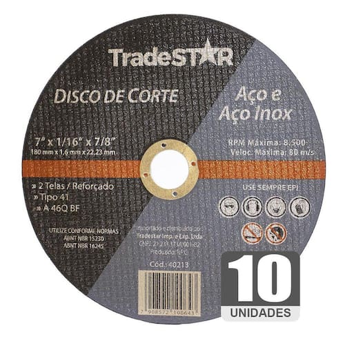 Tamanho: 7 polegadas 180 mm Espessura: 1,6 mm Diâmetro do furo: 22,2 mm Máxima rotação: 8.500 rpm Material: abrasivo de alta qualidade e resina fenólica Indicado para corte em metais ferrosos e não ferrosos, aço inoxidável e materiais de alta dureza Excelente vida útil e capacidade de corte rápido e preciso Atende às normas de segurança da abnt associação brasileira de normas técnicas .