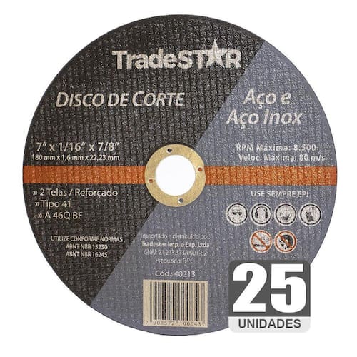 Tamanho: 7 polegadas 180 mm Espessura: 1,6 mm Diâmetro do furo: 22,2 mm Máxima rotação: 8.500 rpm Material: abrasivo de alta qualidade e resina fenólica Indicado para corte em metais ferrosos e não ferrosos, aço inoxidável e materiais de alta dureza Excelente vida útil e capacidade de corte rápido e preciso Atende às normas de segurança da abnt associação brasileira de normas técnicas .