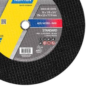 Disco De Corte Para Metal Inox 10Polx3/4Polx3Mm Standard Norton Produto: Disco de corte para metal e inox 10" x 3/4" x 3 mm - Standard Marca: Norton Descrição: O Disco de corte para metal e inox 10" x 3/4" x 3 mm Standard da Norton é a solução perfeita para que exige eficiência e precisão no corte de metais e inox. Este disco foi desenhado para superar as expectativas em termos de durabilidade e performance, ideal para trabalhos contínuos em aço carbono e aço inox. Características • Corte Preciso: Sua espessura de apenas 3 mm permite cortes precisos e limpos, minimizando a perda de material e a necessidade de acabamentos adicionais. • Alta Durabilidade: Construído com duas telas de reforço, oferece maior segurança e uma vida útil estendida, mesmo sob uso intenso. • Versatilidade: Excelente para cortar uma variedade de formas e espessuras como tubos, chapas e barras. • Redução de Custo: O design eficiente reduz o desgaste do disco e do equipamento, resultando em economia nas manutenções e substituições. Com o Disco de Corte Norton Standard, você tem a de um trabalho bem feito, com rapidez e segurança. Adquira já o seu e sinta a diferença que só a Norton pode oferecerEspecificações: Diâmetro: 10" 254 mm Diâmetro do furo: 3/4" 19,10 mm Espessura: 1/8" 3mm 2 telasRotação máxima: 6.015 / 80m/s.