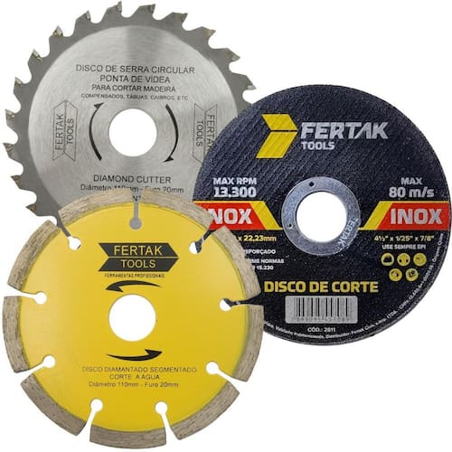 ESPECIFICAÇÕES TÉCNICAS Diâmetro: 115mm. Encaixe: 22mm Material: Grãos abrasivos de alta resistência. Desempenho: Alta remoção de material com baixo desgaste. ITENS INCLUSOS 01 Disco De Corte Serra Circular Para Madeira 24 Dentes 01 Disco Diamantado 110x20mm 01 Disco de Corte Para Metal 115x1x22 Marca: Não Informado Ean: 7894141430634