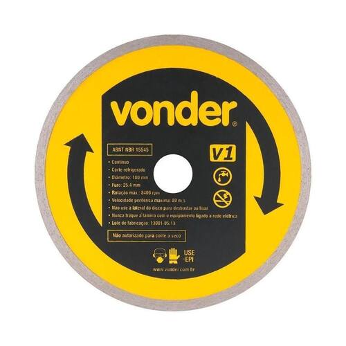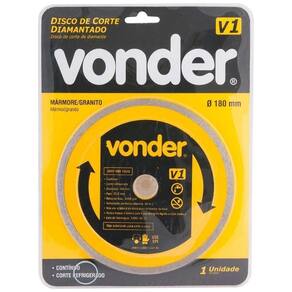 Proporciona maior produtividade e maior profundidade de corte.Características do produto:- marca: vonder;- modelo: v1;- tipo de corte: refrigerado;- perfil do corte: contínuo;- rotações por minuto rpm 8.400/min;- indicado para cortar mármore, granito e cerâmica;- garantia: 3 meses.Dimensões do produto:- diâmetro externo do disco de corte diamantado: 180mm;- diâmetro do furo do disco de corte diamantado: 25,4mm;- altura do segmento diamantado: 5mm;- espessura do segmento diamantado: 2,2mmimagens meramente ilustrativas, os objetos que ambientam as imagens não acompanham o produto Ean: 7893946376130
