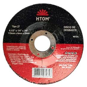 - Marca: HTOM - Referência: HTOM-40565 - Diâmetro: 115mm 4-1/2 - Espessura: 6mm 1/4 - Furo: 22mm 7/8 - Disco com rebaixo - Disco para desbaste em metal, uso em esmerilhadeiras - Elevada capacidade de desbaste com uma vida útil muito longa - Corpo reforçado com malhas de fibra de vidro - Rotação máxima: 13.300 Ean: 7898452032358