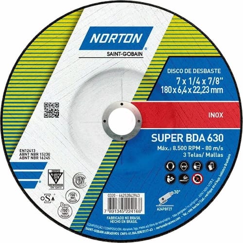Disco de Desbaste Bda 630 180x6,4x22,23mm - 66252842943 - Norton Disco de Desbaste Bda 630 -180x6,4x22,23mm - 66252842943 - Norton Disco de Desbaste BDA 630 180x6,4x22,23mm - 66252842943 - NORTON Descrição: Disco de desbaste com 180mm de diâmetro externo, 22.23mm de diâmetro interno e 6.4mm de espessura. Indicado para desbastes de chapas e perfis nas montagens e manutenção industrial, manutenção pesada diversas indústrias. O disco pode ser utilizado em máquinas portáteis. Os discos são produzidos com as mais atualizadas tecnologias de produto e processo, possui a marca de segurança ABNT e conta com a certificação ISO 9001:2008. Tem também as certificações ISO 14001 e OHSAS 18001, no que se refere a conformidade com os requisitos ambientais, saúde e segurança do trabalho, respectivamente.