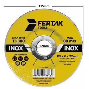 FICHA TÉCNICA Tipo: Disco de corte para metal Diâmetro: 115mm Espessura: 1mm Furo: 22mm Material: Grãos Abrasivos, Resina, Metal e Fibra de Vidro