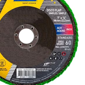 Produto: Disco de lixa flap disc côncavo 7" fibra - Standard Marca: Norton Grão: 60Descrição: O Disco de Lixa Flap Disc Côncavo 4.1/2" da Norton foi especiamente projetado para oferecer uma experiência superior em desbaste e preparação de superfícies, ideal para profissionais exigentes. Composto por aletas de lixa duráveis com costado de tecido e grão de óxido de alumínio, o Disco de Lixa Flap Disc Côncavo da Norton se destaca na categoria de entrada por sua performance notável. Se você busca resultados profissionais em manutenção e pequenos reparos, este é o produto que você precisa. Indicações do uso: Ideal para metais, aço carbono, e aço inoxidável. Especialmente desenvolvido para processos como remoção e nivelamento de superfícies, além de preparação para pintura. Alto rendimento, garantindo uma remoção eficaz do material com menos trocas de disco. Design côncavo, que proporciona um contato otimizado com a superfície de trabalho, aumentando a uniformidade e a qualidade do acabamento.Especificações: Medida: 7 " 180mm Diâmetro do furo: 22,23 mmCostado em fibraFormato: cônico.