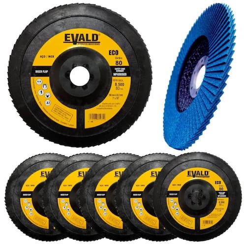 Disco de Lixa Flap Zirconio 7 POL 180 mm Aço Inox Grão 80 Kit 5 Unidades EVALD