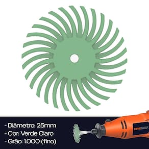 Roda de Polir Cerdas Radial 25mm Grão 1.000 Verde Claro para Micro Retíficas - Marca: Dremax - Referência: RPC006 - Cor: Verde Claro - Gramatura: Grão 1.000 fino - Material: Nylon + grãos de óxido de alumínio - Diâmetro: 25mm Pol. - Furo do centro do disco: 2mm - Trabalha em conjunto com hastes para disco de corte para micro retíficas - As escovas abrasivas radiais têm cerdas muito flexíveis, que permitem a remoção da camada superficial exterior sem danificar a camada de base abaixo - Ótimo para polir pedra, madeira, alumínio, latão, bronze, aço carbono, ferro fundido, aço inoxidável e outros metais - A escova de cerdas radiais é indicada para metalurgia, preparação de tinta, revestimento e remoção de corrosão e muito mais - As cerdas flexíveis requerem menos pressão do que as escovas de aço e adaptam-se aos contornos, mesmo em peças complexas - Nossos discos de polimento detalhados são adequados para rebarbação, limpeza, acabamento, usinagem e polimento de peças detalhadas, áreas minúsculas e locais irregulares - Os discos de cerdas podem ser empilhados, flexíveis, frescos, duráveis e fornecem um acabamento uniforme. Use quantos discos forem necessários - Garantia: 90 dias contra defeitos de fabricação A DREMAX é a primeira e única marca brasileira dedicada exclusivamente às micro retíficas, acessórios e acoplamentos para esta indispensável ferramenta. Seja para trabalhos de precisão, artesanato, modelagem ou reparos, a DREMAX tem o produto certo para você. Marca: Dremax