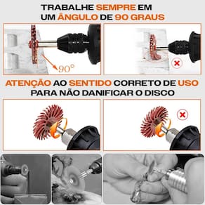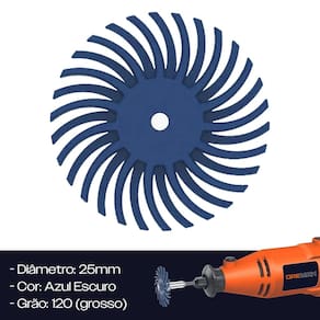 Roda de Polir Cerdas Radial 25mm Grão 120 Azul para Micro Retíficas - Marca: Dremax - Referência: RPC003 - Cor: Azul Escuro - Gramatura: Grão 120 Grosso - Material: Nylon + grãos de óxido de alumínio - Diâmetro: 25mm Pol. - Furo do centro do disco: 2mm - Trabalha em conjunto com hastes para disco de corte para micro retíficas - As escovas abrasivas radiais têm cerdas muito flexíveis, que permitem a remoção da camada superficial exterior sem danificar a camada de base abaixo - Ótimo para polir pedra, madeira, alumínio, latão, bronze, aço carbono, ferro fundido, aço inoxidável e outros metais - A escova de cerdas radiais é indicada para metalurgia, preparação de tinta, revestimento e remoção de corrosão e muito mais - As cerdas flexíveis requerem menos pressão do que as escovas de aço e adaptam-se aos contornos, mesmo em peças complexas - Nossos discos de polimento detalhados são adequados para rebarbação, limpeza, acabamento, usinagem e polimento de peças detalhadas, áreas minúsculas e locais irregulares - Os discos de cerdas podem ser empilhados, flexíveis, frescos, duráveis e fornecem um acabamento uniforme. Use quantos discos forem necessários - : 90 dias contra defeitos de fabricação A DREMAX é a primeira e única marca brasileira dedicada exclusivamente às micro retíficas, acessórios e acoplamentos para esta indispensável ferramenta. Seja para trabalhos de precisão, artesanato, modelagem ou reparos, a DREMAX tem o produto certo para você. Marca: Dremax Ean: 7734625992060