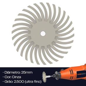Roda de Polir Cerdas Radial 25mm Grão 2.500 Cinza para Micro Retíficas - Marca: Dremax - Referência: RPC007 - Cor: Cinza - Gramatura: Grão 2.500 ultra fino - Material: Nylon + grãos de óxido de alumínio - Diâmetro: 25mm Pol. - Furo do centro do disco: 2mm - Trabalha em conjunto com hastes para disco de corte para micro retíficas - As escovas abrasivas radiais têm cerdas muito flexíveis, que permitem a remoção da camada superficial exterior sem danificar a camada de base abaixo - Ótimo para polir pedra, madeira, alumínio, latão, bronze, aço carbono, ferro fundido, aço inoxidável e outros metais - A escova de cerdas radiais é indicada para metalurgia, preparação de tinta, revestimento e remoção de corrosão e muito mais - As cerdas flexíveis requerem menos pressão do que as escovas de aço e adaptam-se aos contornos, mesmo em peças complexas - Nossos discos de polimento detalhados são adequados para rebarbação, limpeza, acabamento, usinagem e polimento de peças detalhadas, áreas minúsculas e locais irregulares - Os discos de cerdas podem ser empilhados, flexíveis, frescos, duráveis e fornecem um acabamento uniforme. Use quantos discos forem necessários - Garantia: 90 dias contra defeitos de fabricação A DREMAX é a primeira e única marca brasileira dedicada exclusivamente às micro retíficas, acessórios e acoplamentos para esta indispensável ferramenta. Seja para trabalhos de precisão, artesanato, modelagem ou reparos, a DREMAX tem o produto certo para você. Marca: Dremax