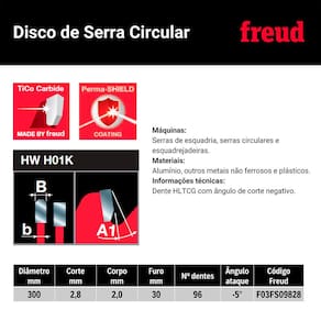Características Marca: Freud Modelo: FR28A001M Diâmetro do disco: 300mm (12Pol) Número de dentes: 96D Garantia: Contra defeito de fábrica