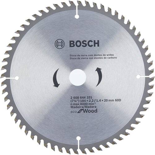 Discos de serra circular Eco for WoodO disco de serra circular Eco for Wood é a melhor escolha para cortes seguros em madeiraOs dentes totalmente afiados oferecem corte suave sem esforçoOs dentes bem selecionados garantem uma boa vida útilProcesso de produção cuidadosamente controlado para satisfazer os padrões de qualidade seguros da Bosch.Descrições do produtoO disco de serra circular Eco for Wood é a melhor escolha para cortes seguros em madeira. Os dentes totalmente afiados oferecem corte suave sem esforço. Além disso, estes dentes bem selecionados garantem uma boa vida útil. O processo de produção cuidadosamente controlado permite que este disco de serra circular satisfaça os padrões de qualidades Bosch. O disco destina-se ao corte de peças de madeira macia, madeira dura, compensado e MDF para o tamanho desejado. É compatível com serras manuais e de bancada.- Qualidade de corte adequada ao trabalho na obra- Durabilidade- Medida: 7.1/4 (184 x 2.2 / 1.4 x 20 mm)- 60 Dentes