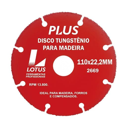 Disco de tungstênio para corte de madeira, diâmetro 110mm 4 1/2 , opções com furo de 20mm e 22,2mm, máxima R.P.M 13.800, não deforma nem trava no material, permitindo excelente refrigeração, segurança e durabilidade. Para cortar madeira dura, macia, placas de compensado, aglomerado, materiais de fibra como MDF, MDP e piso laminado. Atributos do produto Tamanho: 110X22,2MM Tipo corte de madeira Peso produto:0,095g Peso líquido:0,095g Largura: Altura: Comprimento: Código de barras:7908027209310 Marca: Lotus Conteúdo da embalagem: 01 Disco de tungstênio Garantia: Exclusiva de 12 meses Importante: Produtos de decoração não inclusos. Imagens meramente ilustrativas.