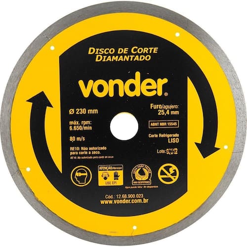 Especialmente indicado para cortar porcelanatos e cerâmicas duras. Utilizado em cortadores de cerâmicas e porcelanatos compatíveis com o diâmetro e furo do disco. Velocidade periférica máxima: 80 m/s.