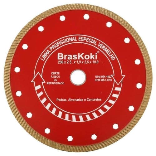Disco Diamantado 230mm Turbojet Vermelho - 22.0940207 - Braskoki Disco Diamantado Turbojet 230mm Vermelho Disco Diamantado 230mm Turbojet Vermelho - 22.0940207 - BRASKOKI Especificações do Produto: - Diâmetro do furo de encaixe: 25,4 mm com bucha redutora para 22,3 mm - Espessura da chapa: 1,9 mm - Espessura do disco: 2,5 mm - Altura da camada diamantada: 10 mm - Corta: Pedras, paredes, alvenarias e concretos - Máquinas utilizáveis:Todas esmerilhadeiras de 9? - Corte: à seco ou refrigerado. - RPM MÁX:- 6790 - RPM MÍN:- 4032 - Formatos disponíveis:contínuo, segmentado, turbojet - Profundidade de corte: Aproximadamente 70 mm (dependendo da ferramenta elétrica utilizada) - Diâmetros disponíveis: 100, 110, 125, 180 e 230 mm.