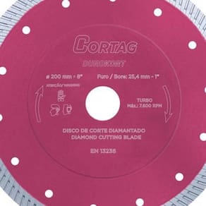 Disco Diamantado Durokort 200Mm - Cortag Disco diamantado durokort pode ser utilizado par corte de pisos e revestimentos de alta dureza. Dados técnicos: - Diâmetro do disco: 200mm - Diâmetro do furo: 25,4mm - Bucha de redução: 20mm Disco diamantado durokort pode ser utilizado par corte de pisos e revestimentos de alta dureza.