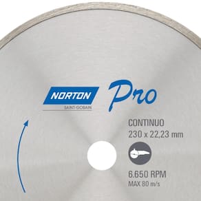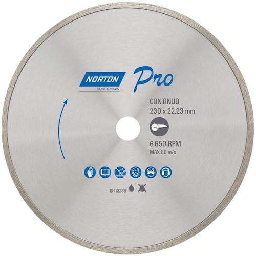 Produto: Disco diamantado liso 230 x 22,23 mm para porcelanato Marca: Norton Descrição: O Disco diamantado liso 230 x 22,23 mm para porcelanato da Norton é a escolha ideal para cortar pedras duras, cerâmicas, azulejos e, principalmente, porcelanatos. Projetado para operações de alto rendimento, ele oferece uma combinação imbatível de ampla cobertura e eficiência de corte. Escolha nosso Disco Diamantado Norton e experimente o corte excepcional que transforma projetos desafiadores em realizações gratificantes. Benefícios: • Cortes rápidos e precisos em superfícies duras; • Durabilidade, mesmo em ambientes exigentes; • Adaptabilidade a diversas condições de trabalho; • Otimização do desempenho para cortes precisosEspecificações: Diâmetro externo: 230 mm;Diâmetro do furo: 22,23 mm;Altura do segmento diamantado: 5 mm;Rotação máxima: 6650 RPM;Tipo: De corte;Superfícies aptas: Porcelanato. Marca: Não Informado