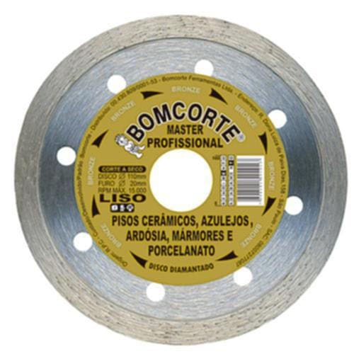 Disco Diamantado Master Bronze Liso 110Mm Indicação: pisos cerâmicos e azulejos. Para porcelanatos refrigerar à água. Características: Liga: Contínua e lisa Classificação da liga: metálica Refrigeração no corte: A seco Diâmetro externo do disco: 110mm Diâmetro do furo: 20mm Espessura da liga: 2,0mm Altura da liga: 8,0mm Profundidade máxima de corte máq. Serra Mármore : 34mm Comprimento máximo de corte linear, por vez: 300mm