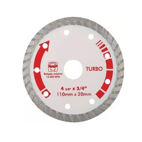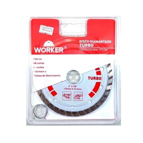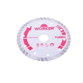 Descrição do Produto Disco de corte Possui borda lisa e segmentada os sulcos ajudam a esfriar o disco proporcionando cortes suaves e mais rápidos Recomendado o uso em: - Telhas - Basaltos - Granitos - Mármores - Telhas de fibrocimento Rotação máxima: 15.000 rpm Diâmetro do disco: 110 mm 4.3/8" Diâmetro do furo: 20 mm 3/4" Marca: WORKER