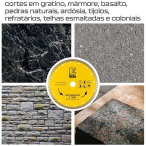- Marca: Eda Profissional - Referência: 0QJ - Diâmetro: 230mm 9 polegadas - Largura da camada diamantada: 10mm - Diâmetro do furo: 25,4mm 1 Pol. - Com adaptador para 22,23 mm 7/8 Polegadas - Espessura: 2,4mm - Indicado para cortes em gratino, mármore, basalto, pedras naturais, ardósia, lajolas, fibra de vidro, tijolos, refratários, telhas esmaltadas e coloniais - Velocidade máxima: 8.500rpm - Corte seco ou refrigerado com água - Os discos de corte a seco, quando refrigerados, proporcionam um melhor rendimento - Peso: 650 gramas - Garantia: 90 dias contra defeitos de fabricação