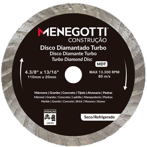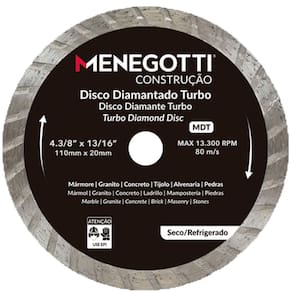 O Disco Diamantado Turbo 4.3/8" (110mm) Menegotti é ideal para cortes rápidos e precisos em materiais como concreto, porcelanato e pedras naturais. Com design turbo, proporciona maior velocidade e eficiência, reduzindo o desgaste e garantindo acabamento de qualidade.