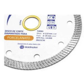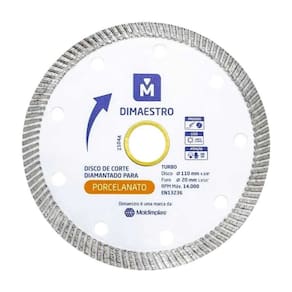 Disco Diamantado Turbo Porcelanato 110 X 20mm - Dimaestro Disco de corte fino para alta precisão e acabamento. Ideal para corte de pisos, porcelanatos e azulejos. Corte seco ou molhado (corte molhado aumenta a vida útil do produto). TAMANHO DO DISCO: Ø110mm (4.38\") FURO DO DISCO: Ø20mm (13/16\") - Acompanha bucha de redução para Ø16mm. ROTAÇÃO MÁXIMA: 14.000 RPM Com ranhuras para passagem do ar quente, suavisando ainda mais o corte. Para afiar, corte materiais abrasivos. Tempo de garantia: 3 meses. ** Preço do produto em PC **
