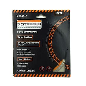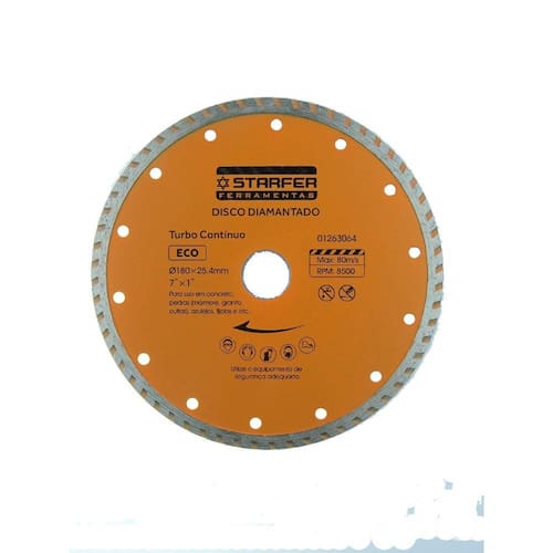 Os discos com banda turbo combinam a velocidade, o acabamento e a estabilidade da banda lisa com a refrigeração da banda segmentada - Corte a seco e refrigerado. Indicada para cortes de granitos, mármore, telhas, telhas fibrocemento e basalto. Ref.:01263064 Marca.: Starfer