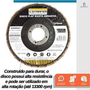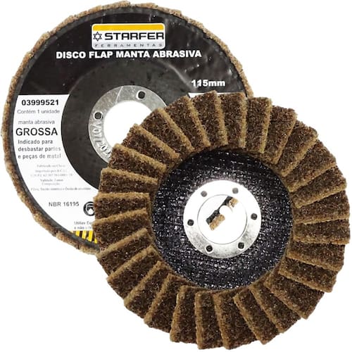 Especificações técnicas: Diâmetro: 4.1/2" (115 mm) Furo: 7/8" (22,23 mm) Manta: Grossa (amarela) Abas: 28 abas sobrepostas (flaps) Tamanho das abas: 25 mm x 17 mm Rotação máxima: 13.300 rpm Velocidade linear máxima: 80 m/s Material: Fibra, tecido sintético e óxido de alumínio Quantidade: 1 unidade Referência: 3999521 Marca: Starfer