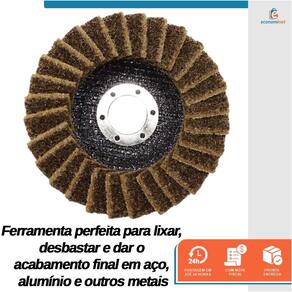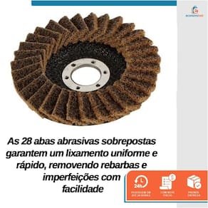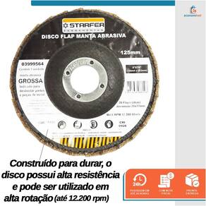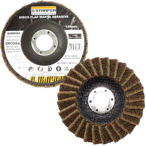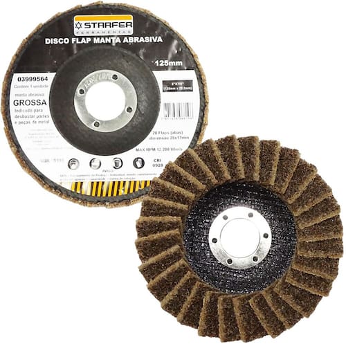 Especificações técnicas: Material: Fibra, tecido sintético e óxido de alumínio Diâmetro: 5" (125 mm) Furo: 7/8" (22,23 mm) Manta: Grossa (amarela) Abas: 28 abas sobrepostas (flaps) Tamanho das abas: 28 mm x 17 mm Rotação máxima: 12200 rpm Velocidade linear máxima: 80 m/s Quantidade: 1 unidade Referência: 3999564 Marca: Starfer