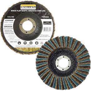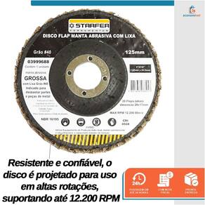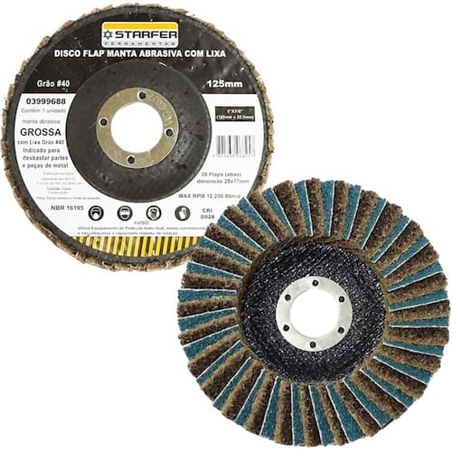 Especificações Técnicas: Material: Fibra, tecido sintético e óxido de alumínio Diâmetro: 5" (125 mm) Furo: 7/8" (22,23 mm) Manta: Grossa (amarela) Grão #40 Abas: 28 (28 mm x 17 mm cada) Rotação máxima: 12.200 RPM Velocidade linear máxima: 80 m/s Quantidade: 1 unidade Referência: 3999688 Marca: Starfer