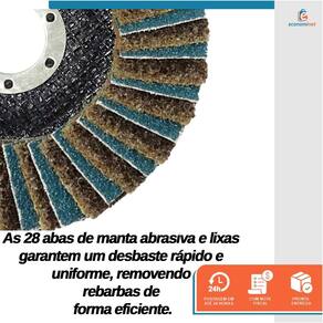 Características: Desempenho Robusto: As 28 abas de manta abrasiva e lixas sobrepostas (flaps) permitem uma remoção rápida e agressiva de material, ideal para desbastes mais pesados e remoção de rebarbas em pontos de soldagem. Precisão em Desbaste: A manta de densidade grossa (amarela) com grão #40 proporciona uma ação abrasiva mais intensa, perfeita para superfícies que requerem um desbaste mais vigoroso. Resistência e Durabilidade: Construído para suportar altas rotações de até 12.200 RPM, este disco é ideal para uso contínuo e oferece uma longa vida útil, mesmo em aplicações exigentes. Versatilidade: Adequado para uma variedade de superfícies metálicas, como aço e alumínio, sendo eficaz no desbaste e na preparação de superfícies para tratamentos subsequentes.