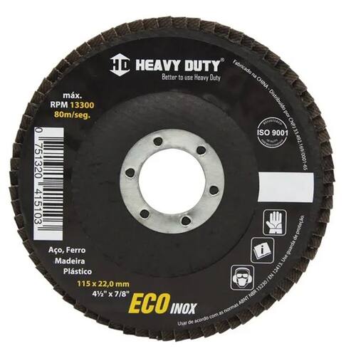 O DISCO FLAP ECOINOX FIBRA RETO 4.1/2 GRANA 120 da Heavy Duty é um produto utilizado em lixadeiras e esmerilhadeiras angulares. Realiza o desbaste e o acabamento ao mesmo tempo. É indicado para operações em metais ferrosos e não ferrosos, aços carbono e de construção.