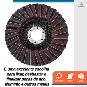 Características: Desempenho Eficiente: As 28 abas de manta abrasiva e lixas sobrepostas flaps garantem um desbaste rápido e uniforme, removendo rebarbas com facilidade e eficiência. Precisão e Versatilidade: A manta média vermelha com grão 60 proporciona um equilíbrio perfeito entre desbaste e acabamento, ideal para superfícies regulares e irregulares. Alta Durabilidade: Projetado para suportar altas rotações, o disco resiste até 13.300 RPM, garantindo excelente durabilidade e desempenho em trabalhos contínuos. Aplicações Diversas: Perfeito para uma variedade de tarefas, desde o desbaste inicial até o acabamento final em diferentes tipos de metais.