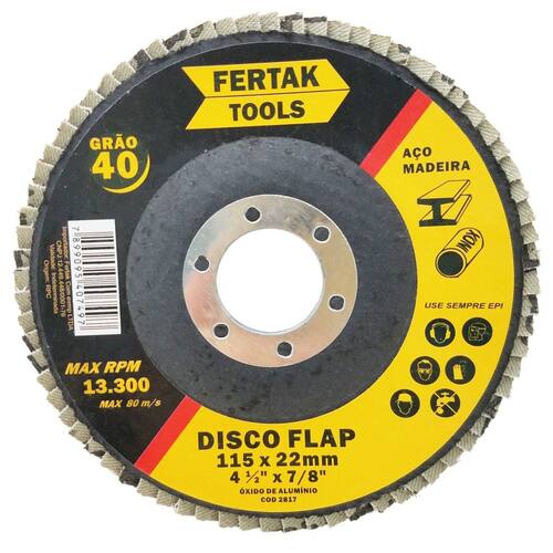 Disco de lixa flap disc 4.1/2" Marca: FERTAK Grão: 60 Caixa com 10 unidades Disco de desbaste tipo flap sextavado. Disco feito de lixas retangulares na base de tecido que são posicionadas como um leque, tendo como base um disco de fibra de vidro. Utilizado em trabalhos de acabamento e polimento de metal, madeira e outros materiais. Especificações Técnicas: Marca: Fertak Tipo de Disco: Flap Reto Grão: 60 Diâmetro: 115 mm Diâmetro do furo: 22 mm Rotação máxima: 13300 rpm Material da Lixa: Óxido de Alumínio Aplicação: aço inox, metais, madeira Use Sempre Equipamentos de Proteção Individual Não pode ser Utilizado com maquinas de corte sem proteção do disco