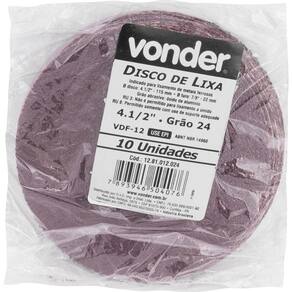 Disco Lixa Fibra 115mm G24 Dvf12 10 Peças - Vonder Conteúdo da embalagem 1 Pacote com 10 discos de lixa Aplicações e dicas de uso Indicado para lixamento de metais ferrosos. Utilizado em máquinas angulares rotativas de acionamento elétrico ou pneumático. Aplicações em estruturas metálicas, indústria naval, fundições de metais ferrosos e indústria automobilística. Destaques e diferenciais Possui costado de fibra que proporciona maior vida útil DETALHES TÉCNICOS