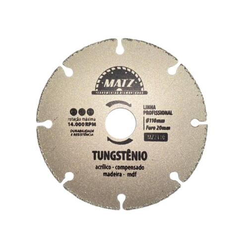 Informações técnicas: Perfil do corte: Segmentado Tipo de corte: A seco Dimensões: - Diâmetro externo: 110mm 4.3/8'' - Diâmetro do furo: 20mm - Espessura: 1,2mm Rotação máxima por minuto RPM : 14.000 - 80m/s Para corte de: Madeira, MDF, compensado e acrílico Proporciona qualidade e produtividade na operação Produto de altíssima qualidade com alta performance