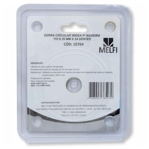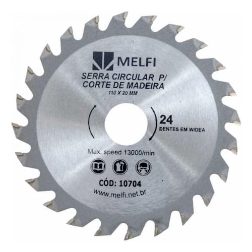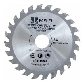 - Marca: Melfi; - Referência: 10704; - Lâmina em aço carbono temperada; - Dentes com ponta de metal duro fixados por brasagem; - Dentes afiados para cortes suaves; - 24 Dentes em widea; - Ângulo de ataque dos dentes agressivo para cortes rápidos; - Acompanha anel de redução (20-16mm).
