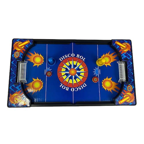 Jogo de disco, jogado em uma mesa com batedores. Agora é sua chance de marcar muitos gols! fácil de carregar, você pode levar para qualquer lugar. Teste sua habilidade e criatividade, desafie seus amigos e prove que você é o melhor! contém: 1 mesa de jogo / 4 pés para mesa / 2 batedores / 2 discos / 1 regra / 2 redes de gol recomendado para crianças a partir de 4 anos.