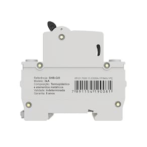 Características do Produto: Marca: Soprano Modelo: 3kA Din Tipo: Unipolar Referência: SHB-GIII Materiais: Termoplástico e elementos metálicos Amperagem: 20A Curva de disparo: C Capacidade de interrupção (kA): 3kA Cor: Branco EAN: 7891154190081