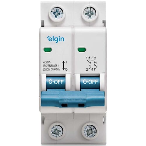 Disjuntor Termomagnético Bipolar Elgin 2 Polos 10a DISJUNTOR TERMOMAGNÉTICO BIPOLAR ELGIN 2 POLOS 10A Os mini disjuntores Elgin são equipamentos destinados à proteção de instalações de baixa tensão contra curto-circuitos e sobrecargas. São construídos rigorosamente dentro das normas, proporcionando o máximo de segurança a sua instalação elétrica residencial ou comercial. Sua construção permite a possibilidade do travamento da manopla sem o comprometimento da proteção dos circuitos. O disjuntor vem em uma embalagem Color Box exclusiva da Elgin, que contém uma tabela de utilização e informações do INMETRO no verso. Características Técnicas: Corrente Nominal (In): 10A; Curva de Disparo: Tipo C; Tensão de Operação (Ue) 2P 415V; Tensão de Isolamento Nominal (UI): 500 V; Tensão de Ruptura: 3KA; Frequência Nominal (CA): 50/60 Hz; Classe de Energia 3; Temperatura de Funcionamento: -25C a 70C; Grau de Proteção: IP20; Tipo de Instalação: DIN 35 mm; Tipo de Disparo: TérmicoeE Magnético Tipo Fixo; Alto nível de Proteção de Cabos; Normas: NBR NM 60898. Ean: 7908412511868