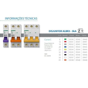 Disjuntor Tripolar 3P 40A Curva C ALBR3 Alumbra Disjuntor Tripolar 3P Curva C 40A 3kA ALBR3 Alumbra Os disjuntores termomagnéticos ALBR3 e ALBR6 foram projetados com tecnologia exclusiva Alumbra. protegem as instalações elétricas e o patrimônio de seus usuários contra curto-circuito e sobrecarga, oferecendo segurança sob medida e dupla proteção. Toda instalação elétrica merece os disjuntores ALBR3. Eles protegem os circuitos elétricos e seus componentes fios, cabos, interruptores, tomadas, etc contra curtos-circuitos e sobrecargas. E o melhor, com preços acessíveis. FIQUE TRANQUILO O selo Inmetro garante que todos os disjuntores ALBR3 foram produzidos sob o mesmo padrão de qualidade certificada. Caracteristicas Técnicas:- Corrente: 40 Amperes;- Tensão Operação: 110 a 415V- Curva: C;- Certificação Inmetro;- Capacidade de Ruptura: 3kA - NBR IEC 60898;- Referência: 39446;