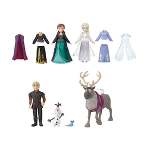 Contém: 3 bonecas, boneco Olaf, boneco Sven, boneco Water Nokk, boneco Bruni e 4 roupas que incluem 4 capas, 4 blusas e 4 saias.
